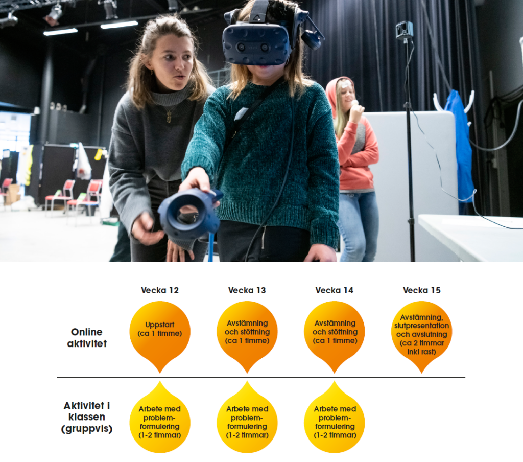 2. Efter uppstartstillfället arbetar tjejerna i grupp med att lösa ett av Volvo CE:s problem. Tidsåtgången är ca 1-2 timmar per vecka under vecka 12-14. Förslagsvis läggs dessa pass i samband med tekniklektionerna. Under vecka 13 och 14 sker en timmes avstämning per vecka med en ingenjörsstudent och en ingenjör från Volvo CE, via Microsoft Teams, för att stötta tjejerna i problemlösningen. Under avstämningarna berättar även ingenjörsstudenten och ingenjören om vad det innebär att vara ingenjör och svarar på frågor från tjejerna.