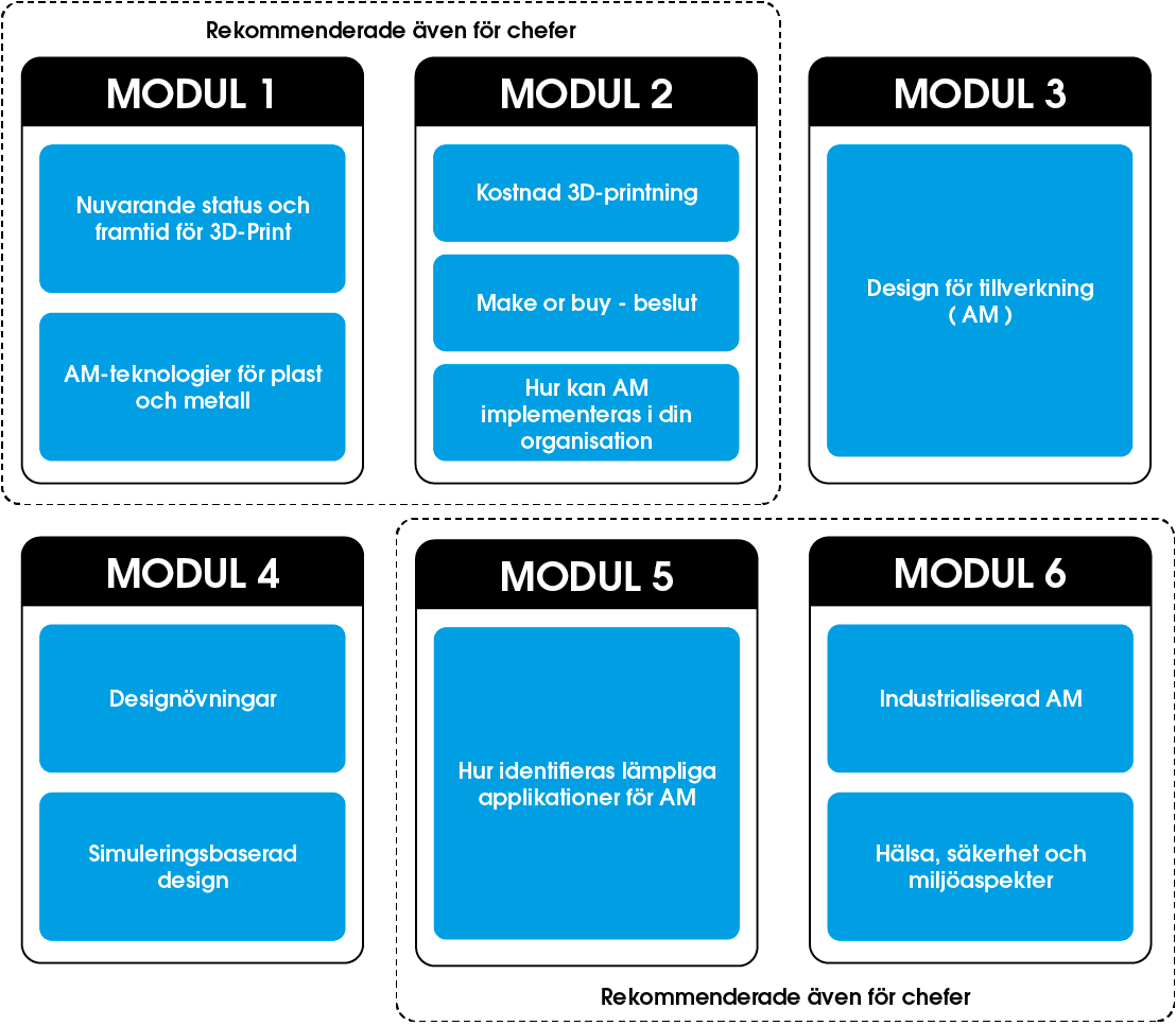 Seminarieserien genomförs tillsammans med Etteplans experter och är uppdelad på sex entimmes moduler med enklare hemuppgifter mellan tillfällena. Inledande och avslutande moduler är anpassade för personer utanför teknik/utveckling, då det är viktigt att hela organisationen förstår möjligheterna med AM. Efter varje avslutad modul kommer det finnas möjlighet att diskutera ämnet separat med en expert.